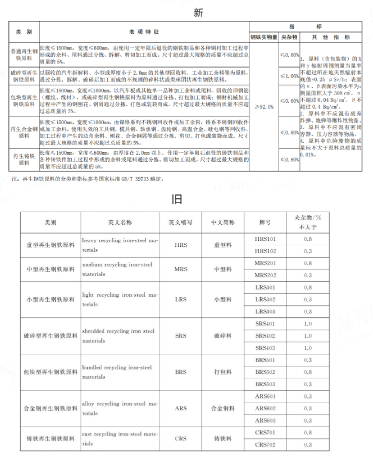 修订前,再生钢铁原料类别分为七类,包括重型、中型、小型、破碎型、包块型、合金钢再生钢铁原料以及铸铁再生钢铁原料。而此次调整后,类别简化为五类,将“重型再生钢铁原料”“中型再生钢铁原料”“小型再生钢铁原料”合并为“普通再生钢铁原料”。这一变动使得分类更加简洁明了,更贴合实际贸易与使用场景,方便企业在进出口报关以及生产使用环节进行操作与管理。